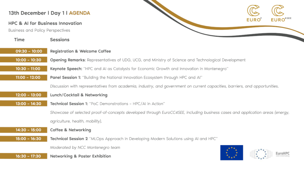 Day 1 will focus on business innovation and policy perspectives, featuring opening remarks from national institutions, a keynote on the role of HPC and AI in economic growth, and a high-level panel on building Montenegro’s innovation ecosystem. The program will also include technical sessions, with PoC demonstrations developed through EuroCC4SEE in sectors such as energy, agriculture, health, and mobility, followed by a session on MLOps approaches moderated by the NCC Montenegro team. A networking and poster exhibition will showcase student work and local startup projects.