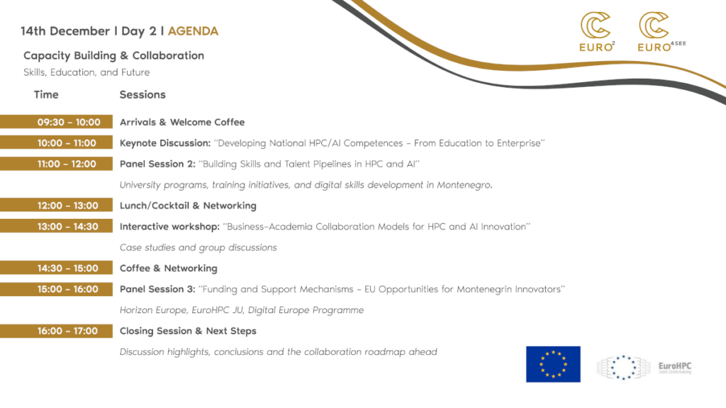 Day 2 will shift toward skills, education, and collaboration. Participants will explore national competence development in HPC/AI, talent pipeline building, and business–academia cooperation models through panels and an interactive workshop. The event will conclude with an overview of EU funding opportunities (Horizon Europe, EuroHPC JU, Digital Europe Programme) and a roadmap for further collaboration within the EuroCC4SEE network.