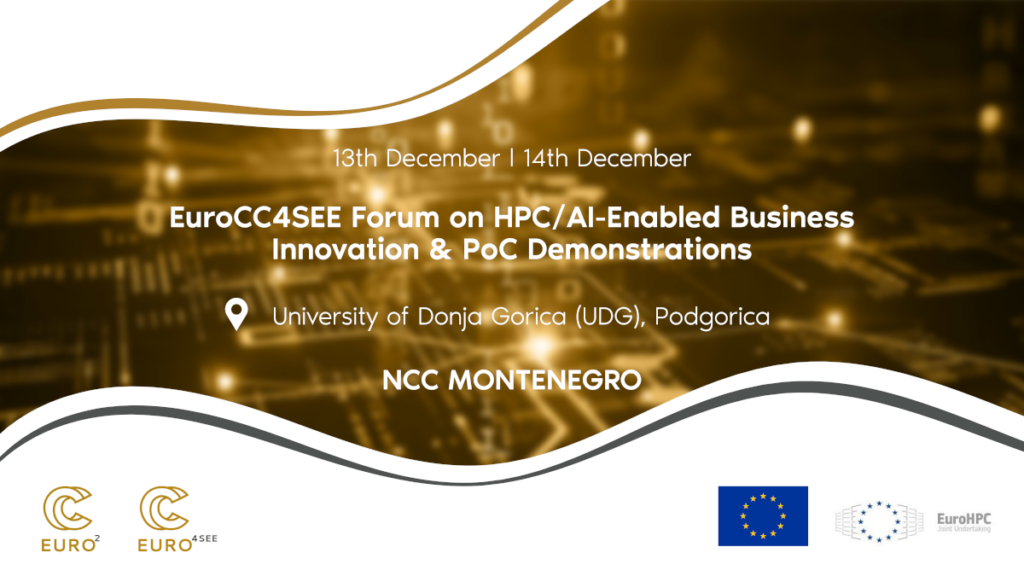 NCC Monetenegro will host the EuroCC4SEE Forum on HPC/AI-Enabled Business Innovation & PoC Demonstrations on 13–14 December, bringing together representatives from academia, industry, government, and the startup community. The two-day event will highlight how High-Performance Computing (HPC) and Artificial Intelligence (AI) can accelerate innovation, strengthen national capacities, and support Montenegro’s digital transformation.