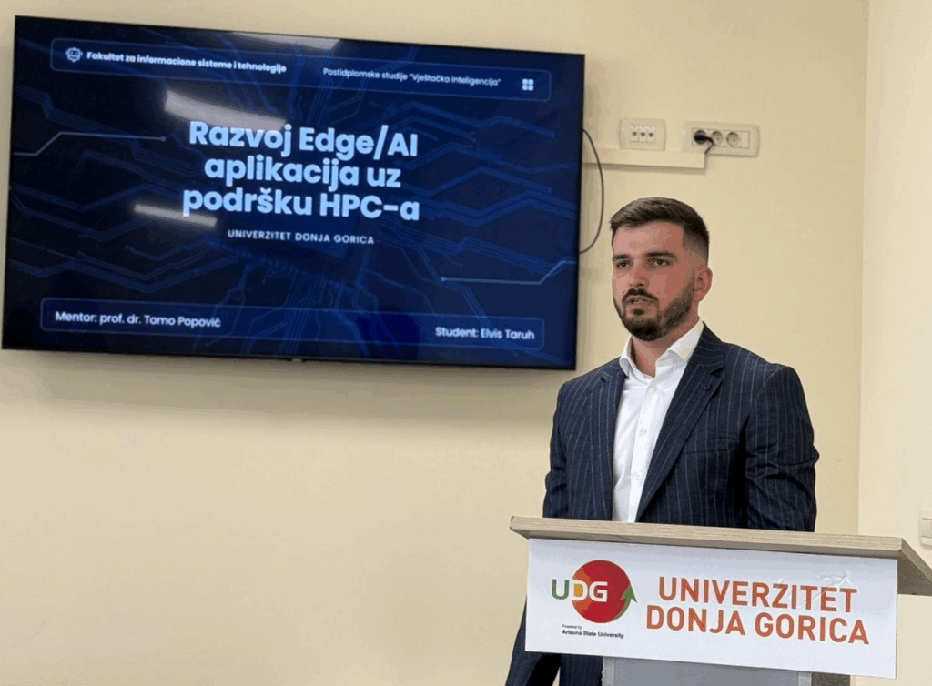 Mr. Elvis Taruh successfully defended his master’s thesis titled “Development of Edge/AI Applications with HPC” at the Faculty of Information Systems and Technologies, University of Donja Gorica.